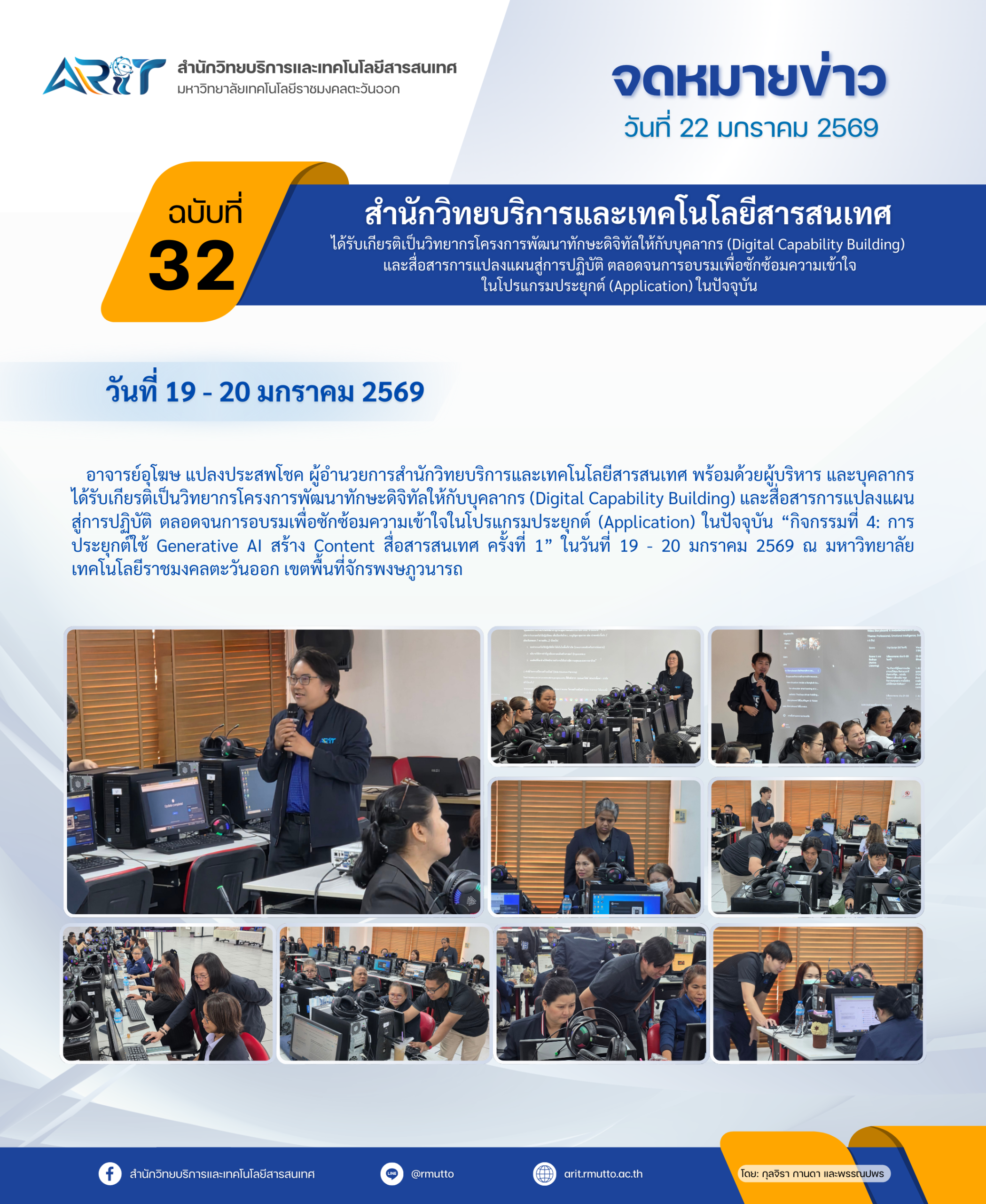 วันที่ 19 – 20 มกราคม 2569 อาจารย์อุโฆษ แปลงประสพโชค ผู้อำนวยการสำนักวิทยบริการและเทคโนโลยีสารสนเทศ พร้อมด้วยผู้บริหาร และบุคลากร ได้รับเกียรติเป็นวิทยากรโครงการพัฒนาทักษะดิจิทัลให้กับบุคลากร (Digital Capability Building) และสื่อสารการแปลงแผนสู่การปฏิบัติ ตลอดจนการอบรมเพื่อซักซ้อมความเข้าใจในโปรแกรมประยุกต์ (Application) ในปัจจุบัน “กิจกรรมที่ 4: การประยุกต์ใช้ Generative AI สร้าง Content สื่อสารสนเทศ ครั้งที่ 1” ในวันที่ 19 – 20 มกราคม 2569 ณ มหาวิทยาลัยเทคโนโลยีราชมงคลตะวันออก เขตพื้นที่จักรพงษภูวนารถ