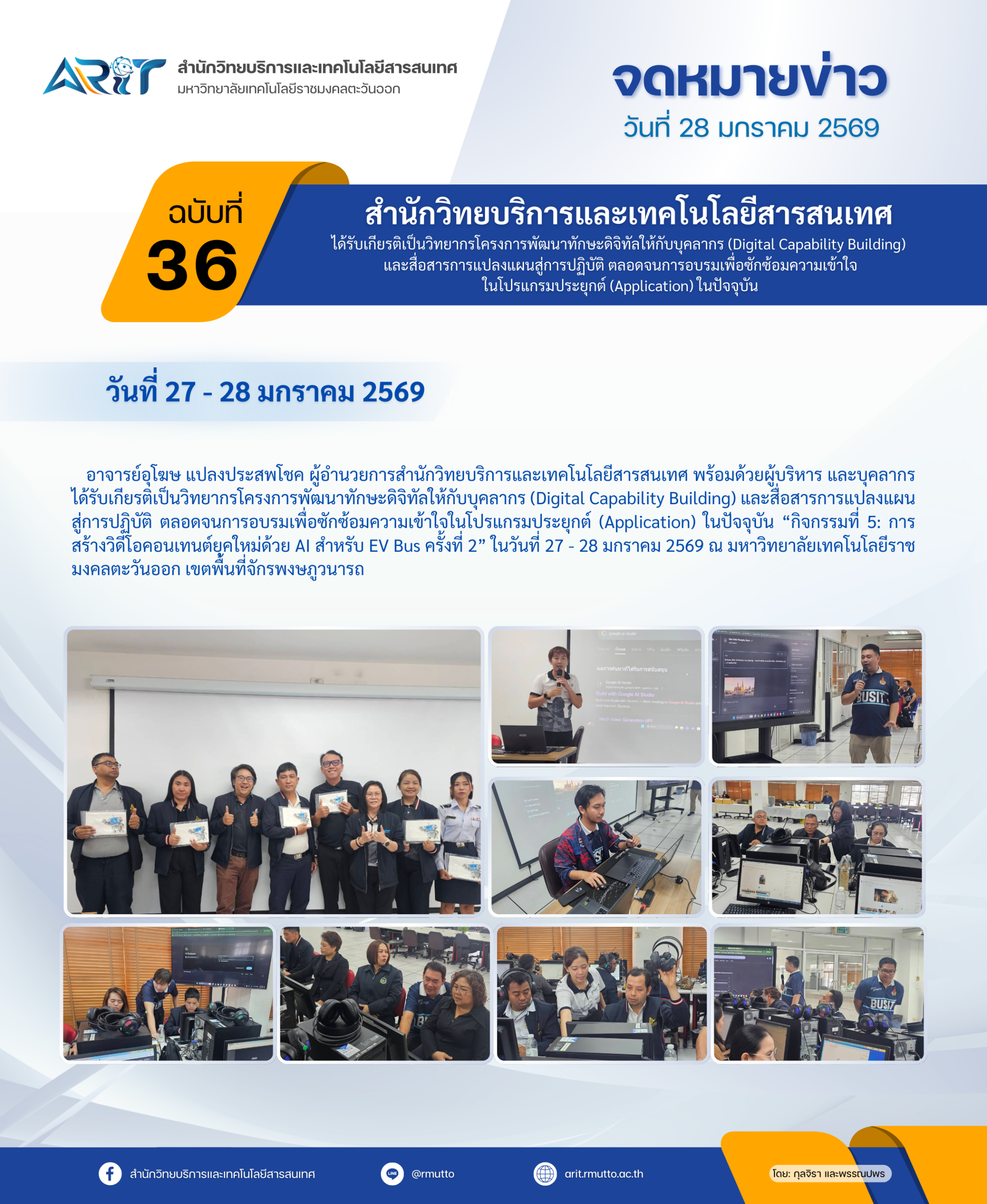 วันที่ 27 – 28 มกราคม 2569 อาจารย์อุโฆษ แปลงประสพโชค ผู้อำนวยการสำนักวิทยบริการและเทคโนโลยีสารสนเทศ พร้อมด้วยผู้บริหาร และบุคลากร ได้รับเกียรติเป็นวิทยากรโครงการพัฒนาทักษะดิจิทัลให้กับบุคลากร (Digital Capability Building) และสื่อสารการแปลงแผนสู่การปฏิบัติ ตลอดจนการอบรมเพื่อซักซ้อมความเข้าใจในโปรแกรมประยุกต์ (Application) ในปัจจุบัน “กิจกรรมที่ 5: การสร้างวิดีโอคอนเทนต์ยุคใหม่ด้วย AI สำหรับ EV Bus ครั้งที่ 2” ในวันที่ 27 – 28 มกราคม 2569 ณ มหาวิทยาลัยเทคโนโลยีราชมงคลตะวันออก เขตพื้นที่จักรพงษภูวนารถ
