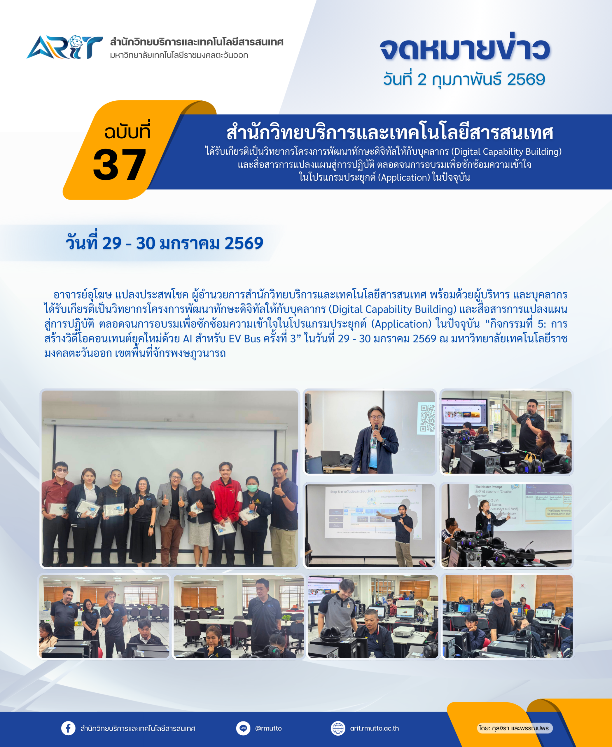 วันที่ 29 – 30 มกราคม 2569 อาจารย์อุโฆษ แปลงประสพโชค ผู้อำนวยการสำนักวิทยบริการและเทคโนโลยีสารสนเทศ พร้อมด้วยผู้บริหาร และบุคลากร ได้รับเกียรติเป็นวิทยากรโครงการพัฒนาทักษะดิจิทัลให้กับบุคลากร (Digital Capability Building) และสื่อสารการแปลงแผนสู่การปฏิบัติ ตลอดจนการอบรมเพื่อซักซ้อมความเข้าใจในโปรแกรมประยุกต์ (Application) ในปัจจุบัน “กิจกรรมที่ 5: การสร้างวิดีโอคอนเทนต์ยุคใหม่ด้วย AI สำหรับ EV Bus ครั้งที่ 3” ในวันที่ 29 – 30 มกราคม 2569 ณ มหาวิทยาลัยเทคโนโลยีราชมงคลตะวันออก เขตพื้นที่จักรพงษภูวนารถ