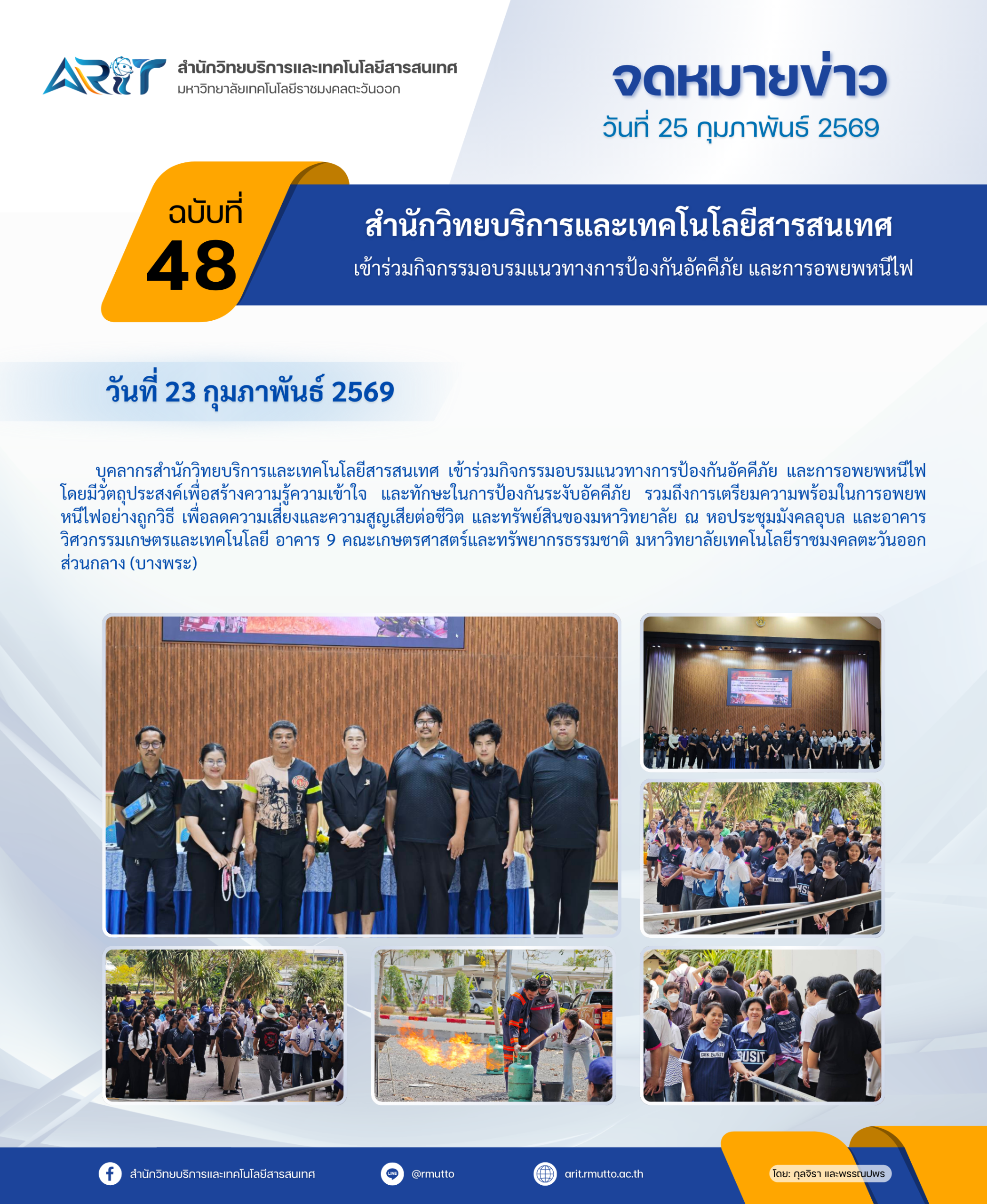 วันที่ 23 กุมภาพันธ์ 2569 บุคลากรสำนักวิทยบริการและเทคโนโลยีสารสนเทศ เข้าร่วมกิจกรรมอบรมแนวทางการป้องกันอัคคีภัย และการอพยพหนีไฟ โดยมีวัตถุประสงค์เพื่อสร้างความรู้ความเข้าใจ และทักษะในการป้องกันระงับอัคคีภัย รวมถึงการเตรียมความพร้อมในการอพยพหนีไฟอย่างถูกวิธี เพื่อลดความเสี่ยงและความสูญเสียต่อชีวิต และทรัพย์สินของมหาวิทยาลัย ณ หอประชุมมังคลอุบล และอาคารวิศวกรรมเกษตรและเทคโนโลยี อาคาร 9 คณะเกษตรศาสตร์และทรัพยากรธรรมชาติ มหาวิทยาลัยเทคโนโลยีราชมงคลตะวันออก ส่วนกลาง (บางพระ)