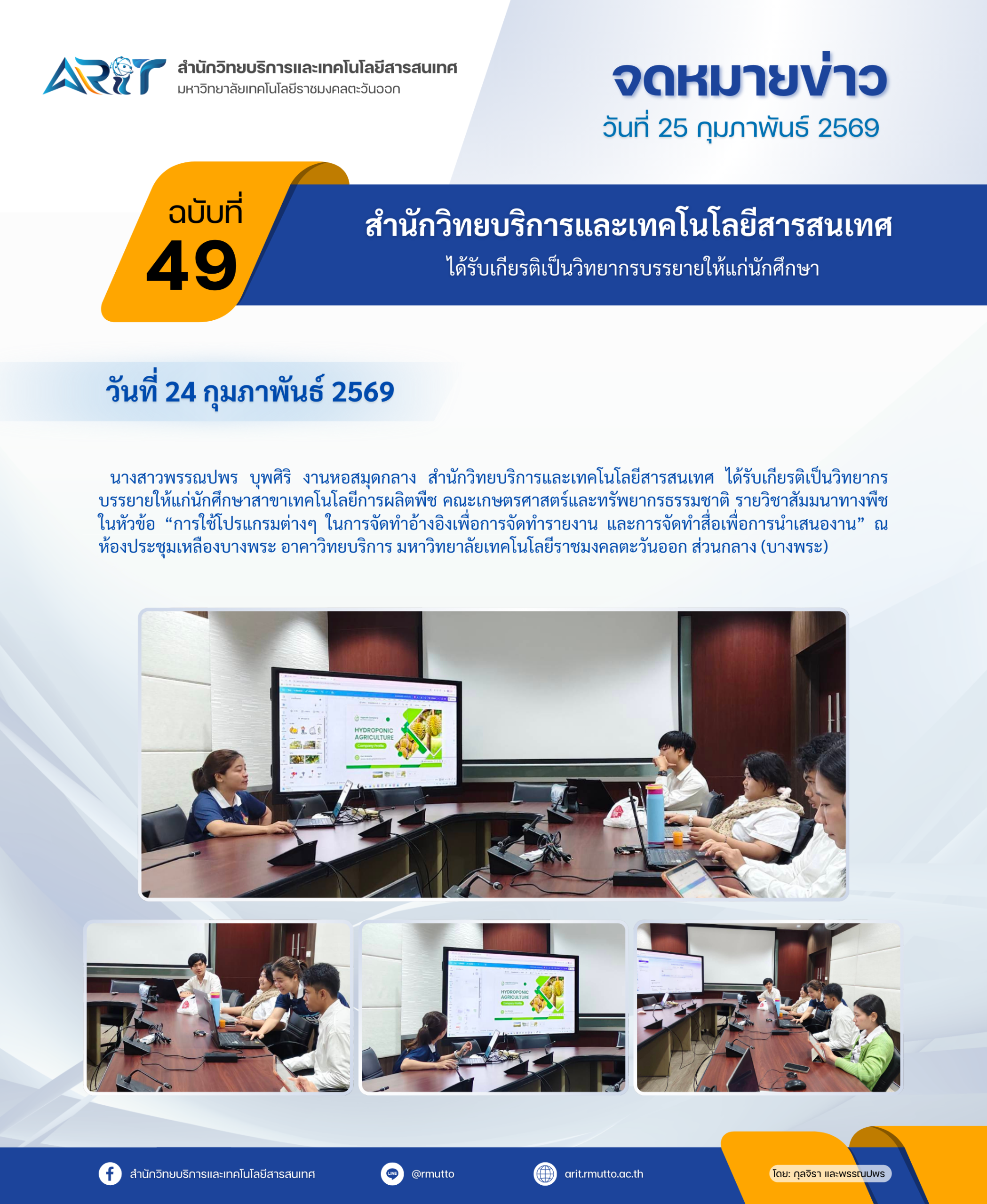 วันที่ 24 กุมภาพันธ์ 2569 นางสาวพรรณปพร บุพศิริ งานหอสมุดกลาง สำนักวิทยบริการและเทคโนโลยีสารสนเทศ ได้รับเกียรติเป็นวิทยากรบรรยายให้แก่นักศึกษาสาขาเทคโนโลยีการผลิตพืช คณะเกษตรศาสตร์และทรัพยากรธรรมชาติ รายวิชาสัมมนาทางพืช ในหัวข้อ “การใช้โปรแกรมต่างๆ ในการจัดทำอ้างอิงเพื่อการจัดทำรายงาน และการจัดทำสื่อเพื่อการนำเสนองาน” ณ ห้องประชุมเหลืองบางพระ อาคาวิทยบริการ มหาวิทยาลัยเทคโนโลยีราชมงคลตะวันออก ส่วนกลาง (บางพระ)